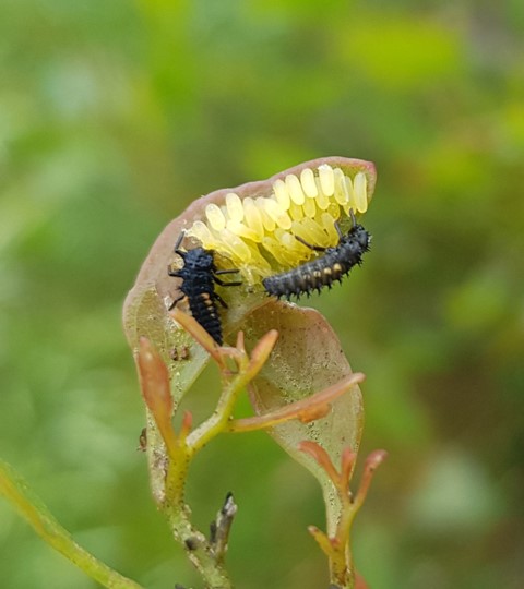 Carolin is working on Paropsisterna cloelia – the eucalyptus variegated beetle (EVB), a relatively recent arrival and a pest which is thought to have the potential to become more of a problem than Paropsis charybdis (the eucalyptus tortoise beetle). This is because of its ability to produce more generations per year and be active for a longer period throughout the year. EVB seems to be spreading fast, and may be out-competing P. charybdis in some places.