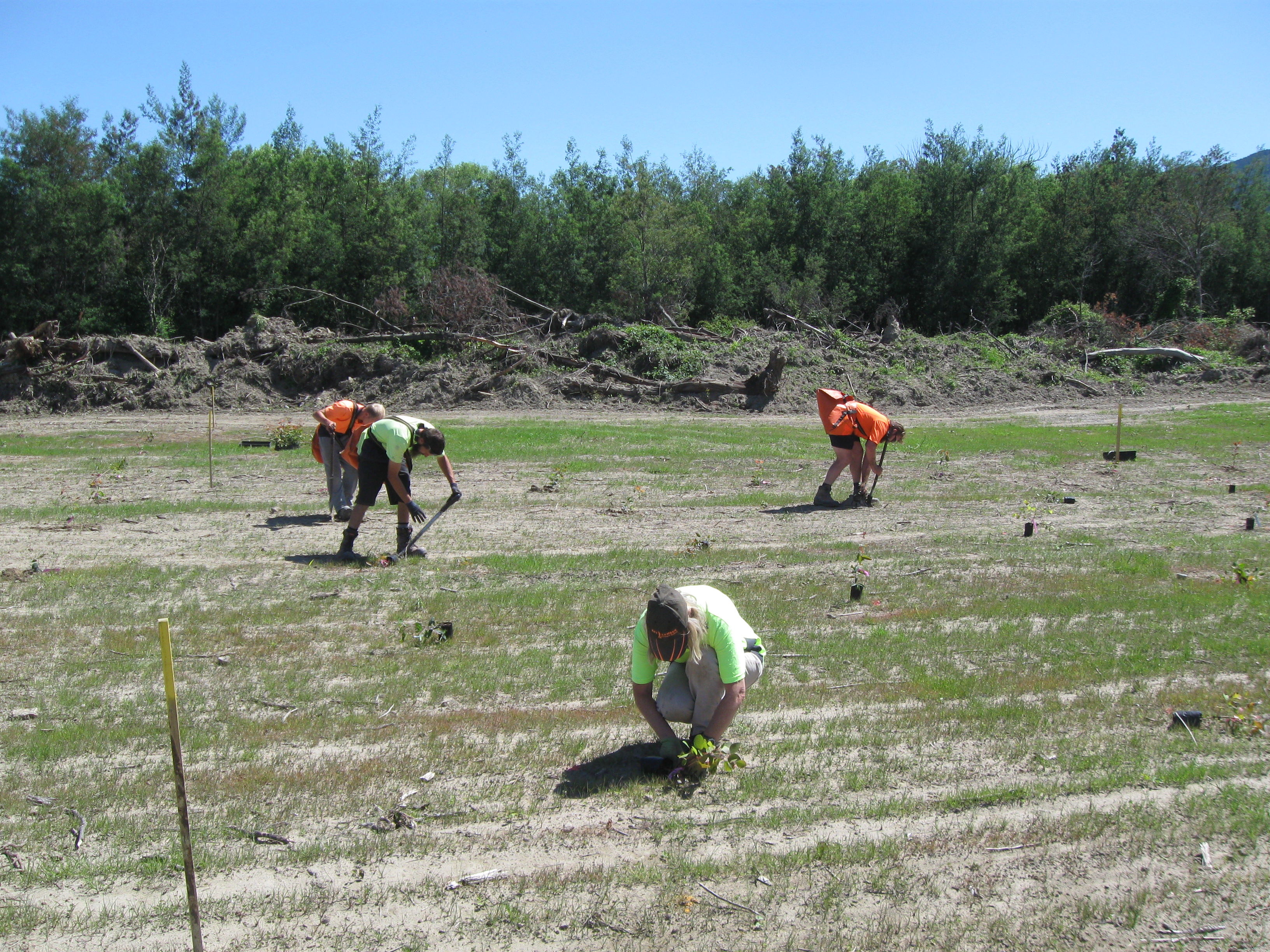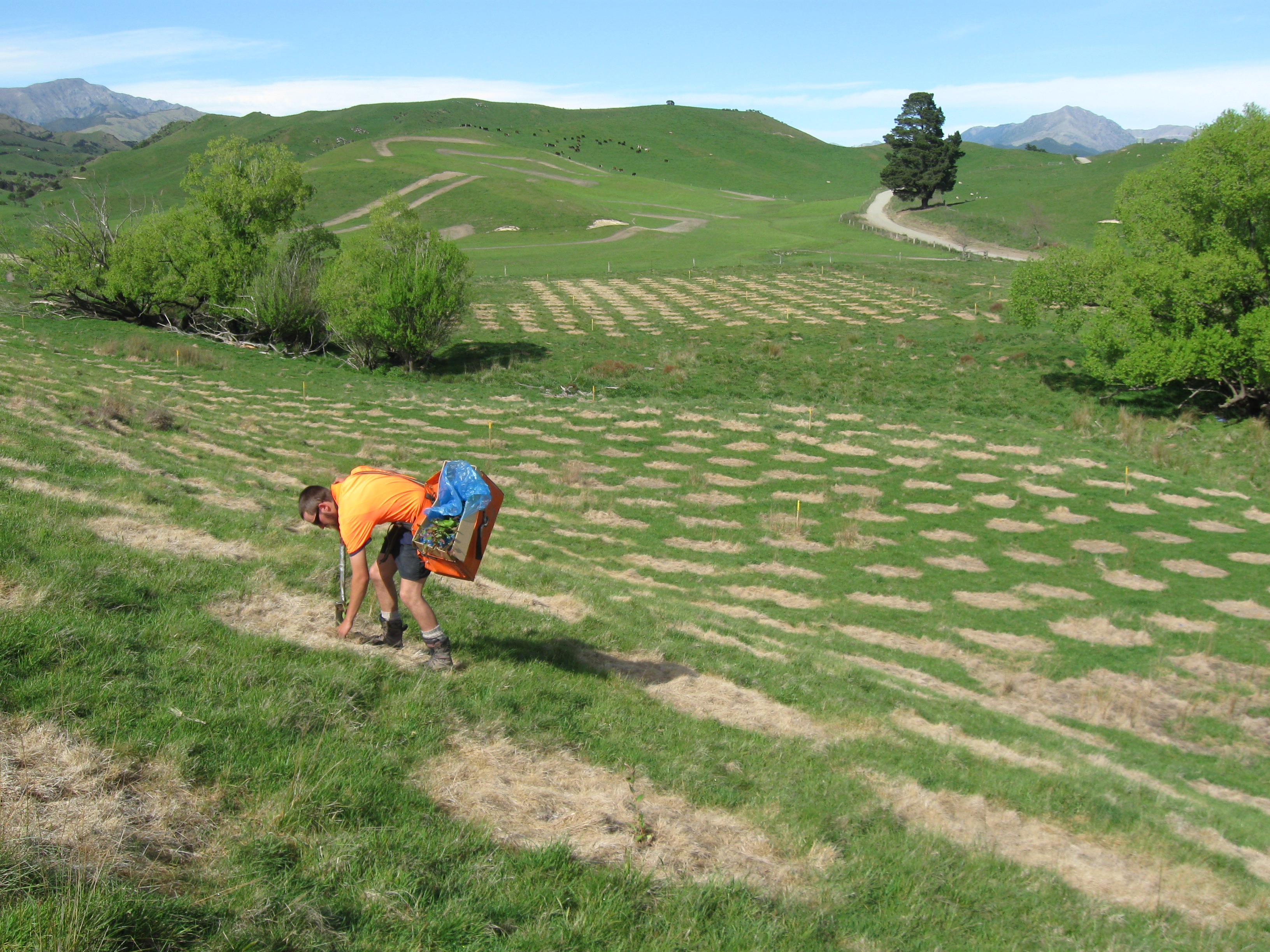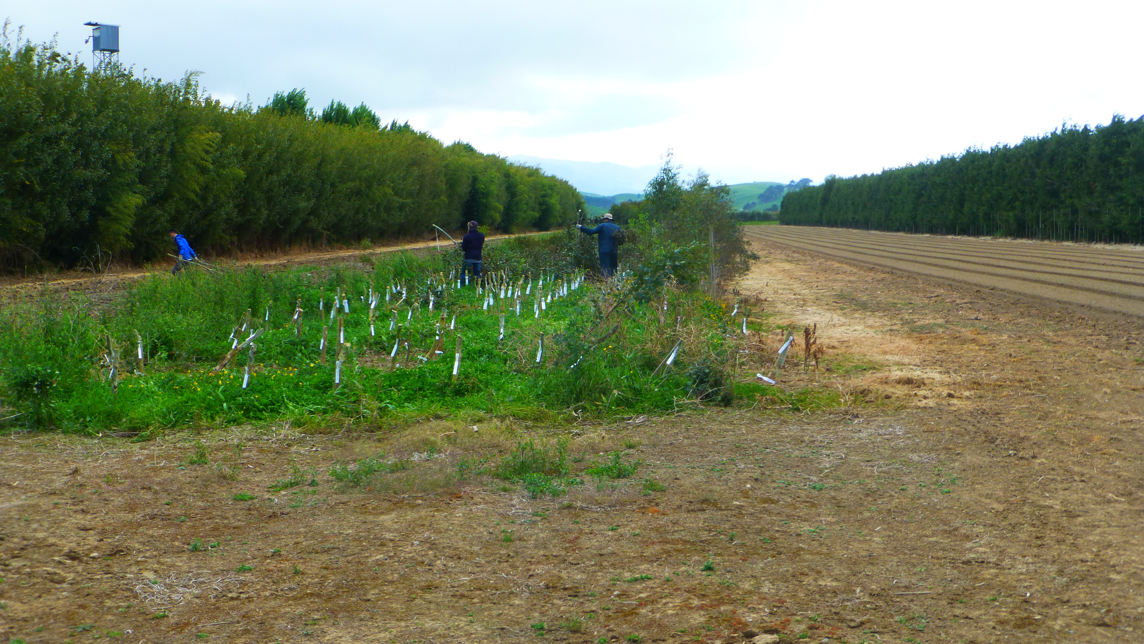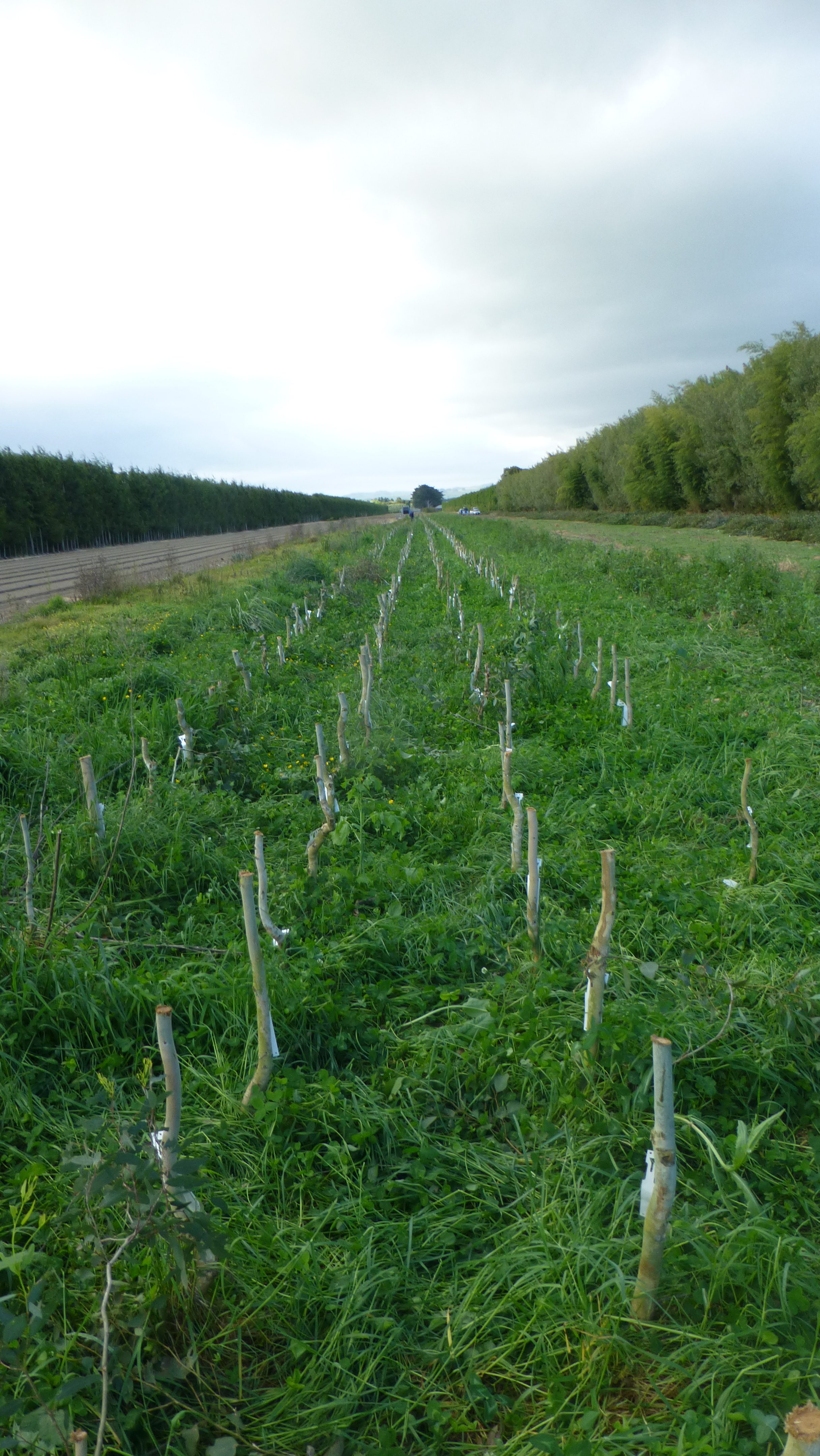 A large trial has been established in stony silt site on Wairau River reserve land owned by Marlborough District Council. a thick cover of woody weeds and vines were removed and the site oversown with grass/clover mix prior to planting. A smaller step-out trial was planted on ex pasture at the Dillon’s property up the Waihopai Valley. The trial design is a modified version of an optimised design, a design which has been used for clonal testing by the Radiata Pine Breeding Company since 2013. It is an efficient use of small numbers of plants specifically when using ramets per clone.