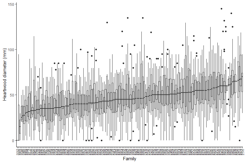 As part of work towards my first objective, I assessed the Cuddon E. quadrangulata breeding trial by coring over 400 trees in October 2020. Heartwood quantity was measured from the cores. Preliminary analysis of the data suggested heartwood quantity is under genetic control in this trial and not strongly correlated to tree diameter, indicating the need to consider heartwood quantity as an independent trait to DBH. Collapse was detected during drying in some of the core samples. Extractives content, volumetric and tangential shrinkage, recoverable collapse and basic density will be measured soon.